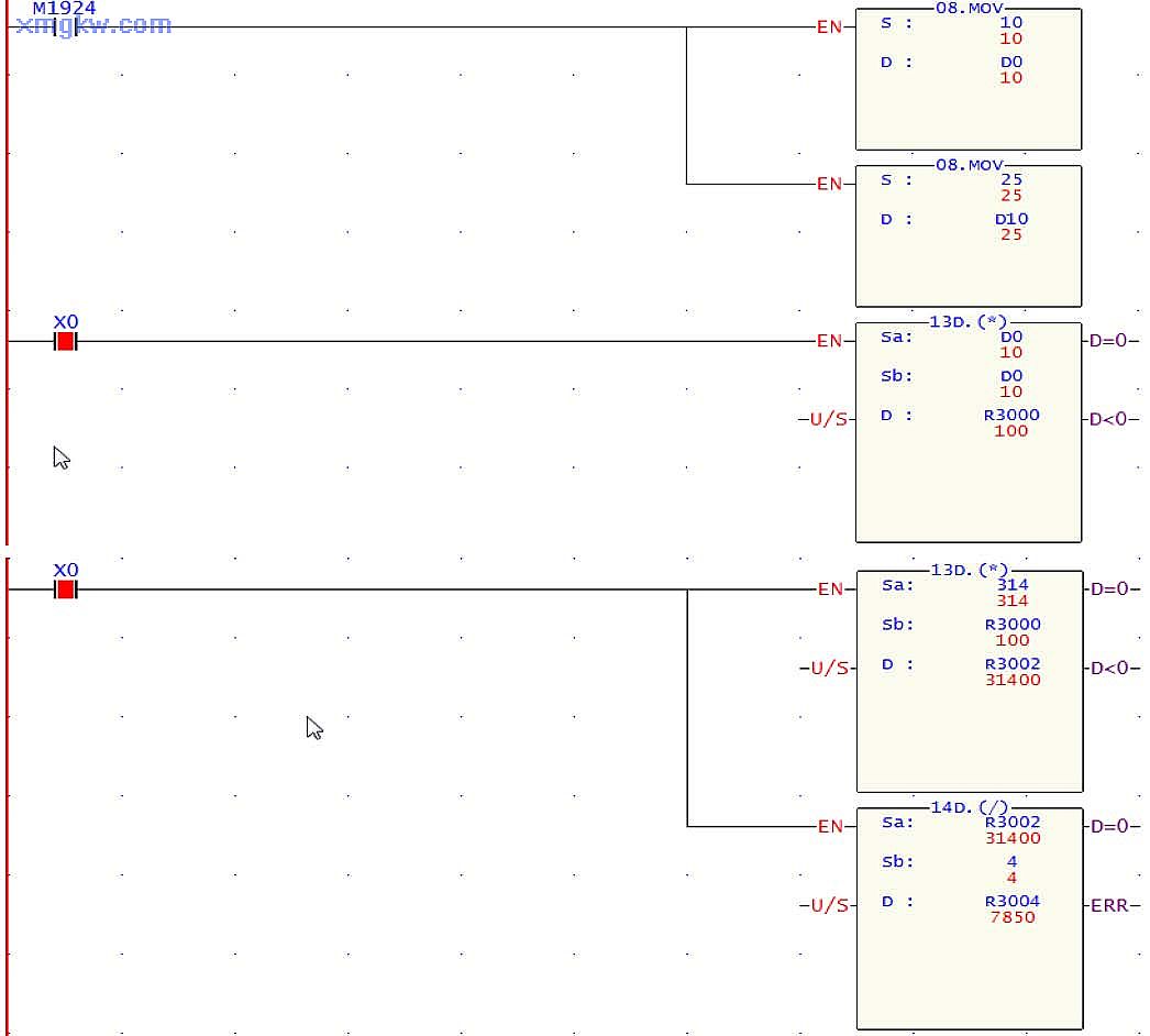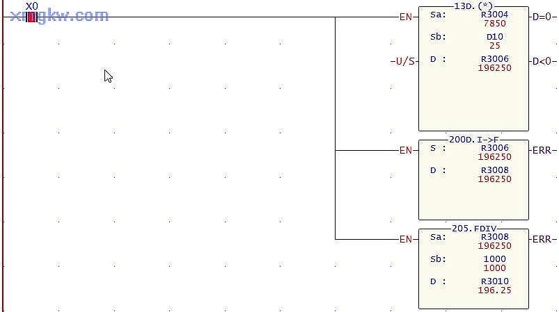 涉及到小數點(diǎn)的精確運算時(shí),一般需用浮點(diǎn)數運算指令,但用浮點(diǎn)數運算指令需要轉換 ,比較繁瑣。本例先用整型四則運算指令放大運算數據,再將運算結果轉換成浮點(diǎn)數,就可實(shí)現小數點(diǎn)的精確運算,如此一來(lái)便只需一個(gè)轉換指令,讓運算過(guò)程簡(jiǎn)單而準確。