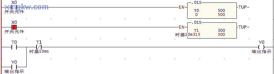 【控制需求】開(kāi)關(guān)由 OFF→ON動(dòng)作時(shí),延遲 5秒鐘后指示燈才被點(diǎn)亮;開(kāi)關(guān)由 ON→OFF動(dòng)作時(shí),延遲 3秒后指示燈才熄滅。