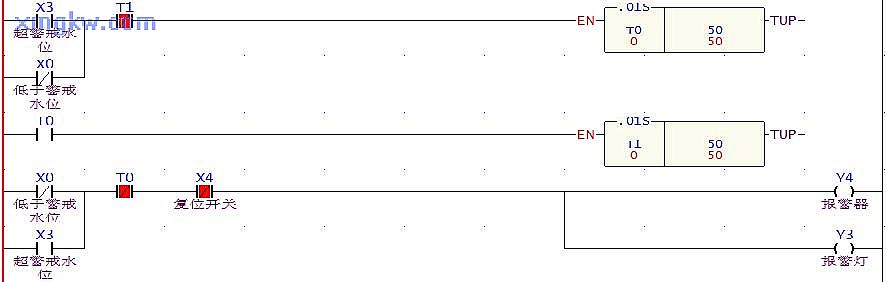 當塔內水位低于水位警戒下限(警戒水位)時(shí): X0=OFF,X1=OFF,X2=OFF,X3=OFF。因 X1=OFF,其常閉接點(diǎn)導通, Y1=ON,給水泵啟動(dòng),同時(shí) X0=OFF,其常閉接點(diǎn)導通,報警電路被執行, Y3=ON, Y4=ON,報警燈閃爍,報警器鳴叫。
