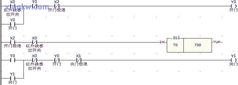 只要人進(jìn)入紅外線(xiàn)傳感器區域, X0=ON,此時(shí)只要門(mén)未在開(kāi)門(mén)極限開(kāi)關(guān)處( X2=OFF),Y0=ON并自保,都會(huì )執行開(kāi)門(mén)的動(dòng)作。