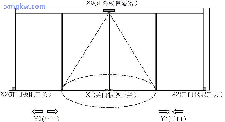 當人進(jìn)入紅外線(xiàn)傳感器區域時(shí),開(kāi)門(mén)電機啟動(dòng),門(mén)自動(dòng)打開(kāi),直到碰到開(kāi)門(mén)極限停止。